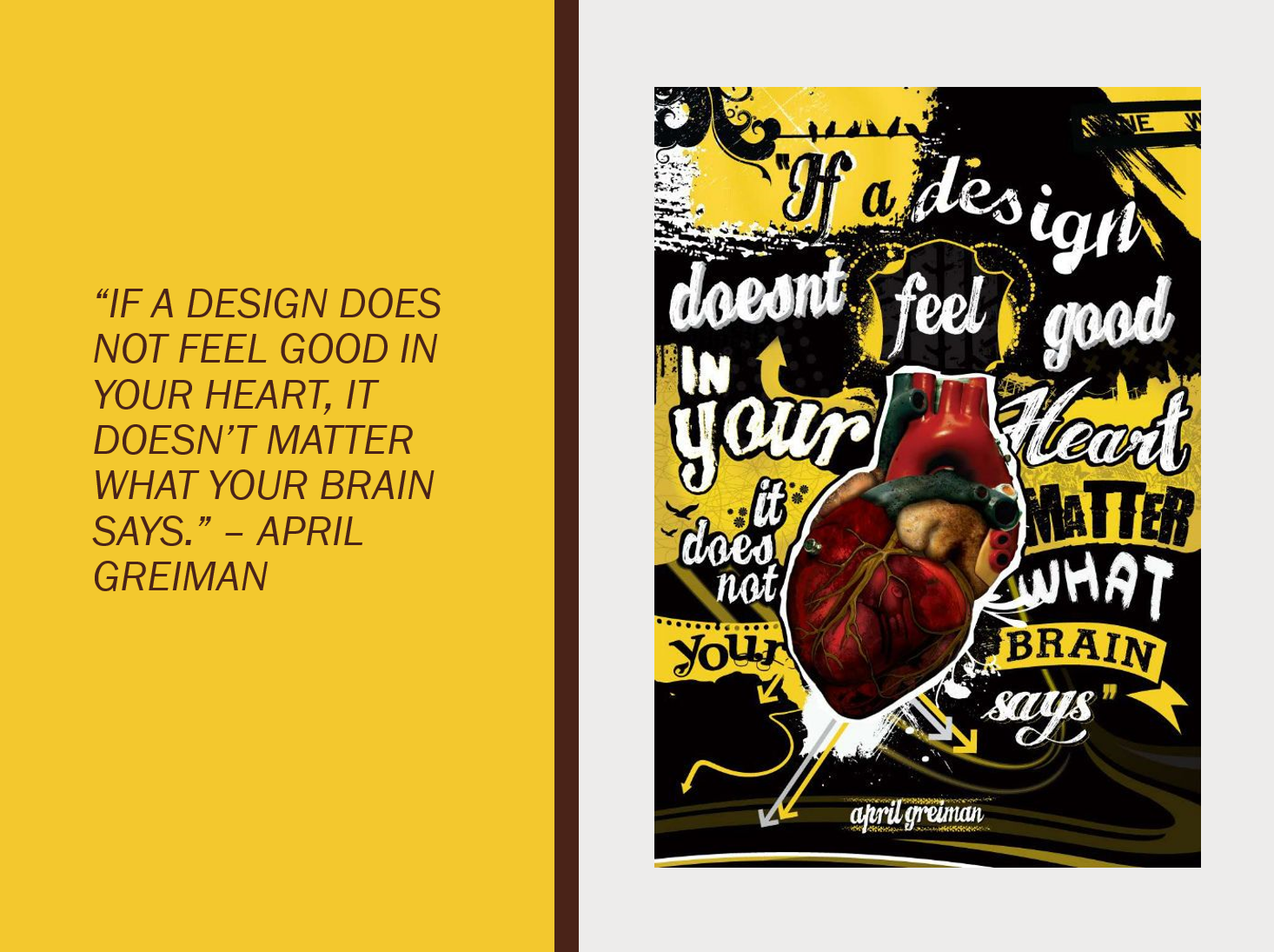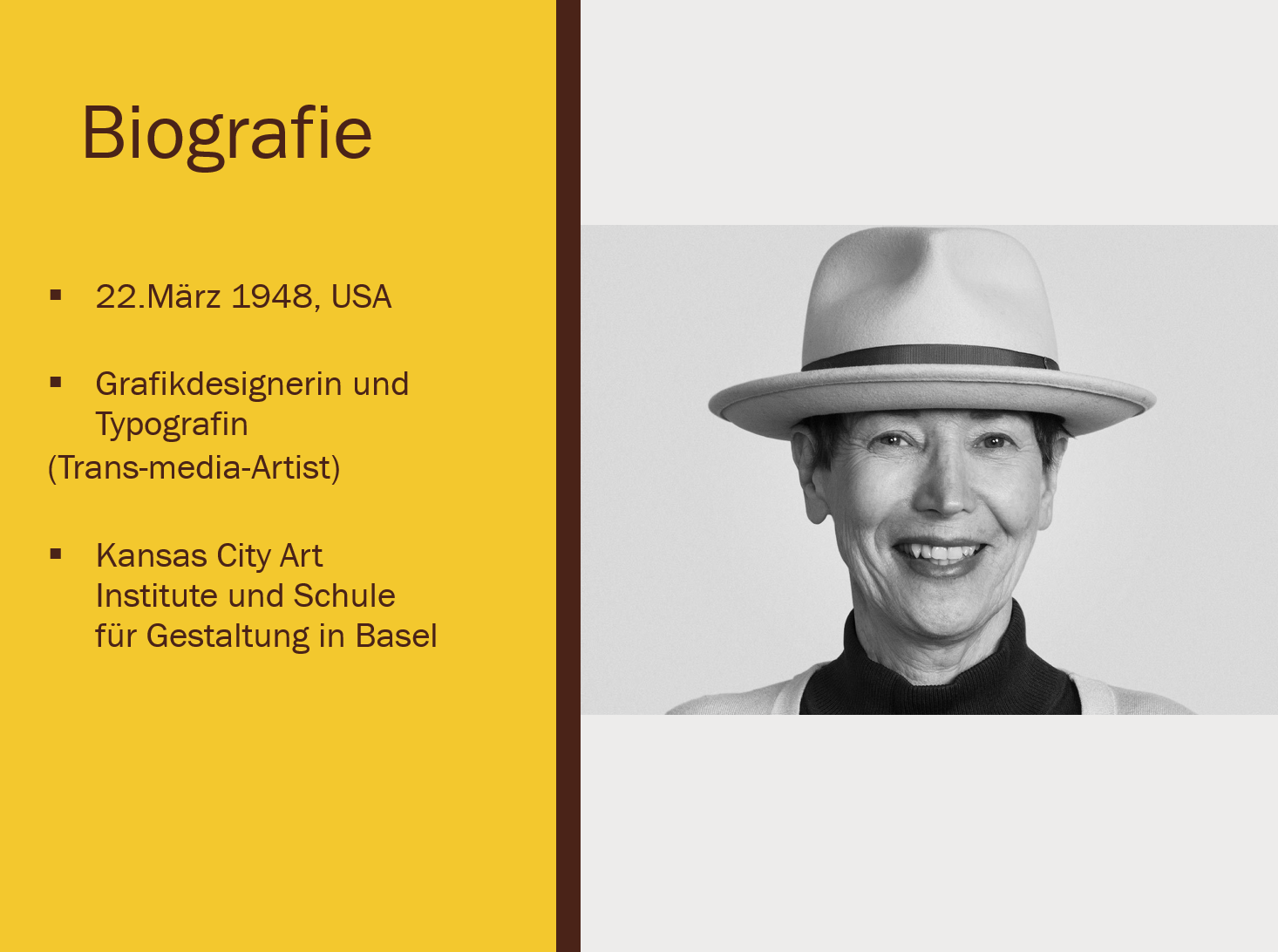 April Greiman wurde 1948 in den USA geboren und lehrte am Kansas City Art Institute und in Basel an der Schule für Gestaltung als Trans-media-artistin. Besonders auf dem Gebiet der digitalen Medien war sie eine der einflussreichsten Grafikerinnen. April Greiman’s Stil nennt sich California-New-Wave-Stil, welchen sie vor allem in ihrem Studio namens «Made in Spain» anwendet. Ihre Arbeiten beinhalten unter anderem räumliche Qualitäten, wirken für den Betrachter oft schwebend und sind in Schichten übereinander angeordnet. Diese Eindrücke werden natürlich durch den Stil von April Greiman gefördert. Der Stil «The New Wave Typography» wurde durch Punk und der postmodernen Sprachtheorie beeinflusst und hält sich auf keinen Fall an gitterbasierte Anordnungskonventionen. April Greiman’s berühmteste Arbeit ist das grösste Ölbild der Welt am Wilshire-Vermont LA subway terminal mit dem Namen «Hand holding a bowl of rice».