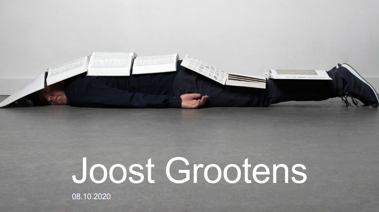 Joost Grootens studierte Architekturdesign und gründete sein eigenes Studio 1995. Der Designstil dieses Designers ist klar, direkt und versucht komplexe Informationen zu organisieren. Ein beispielhaftes Werk, dass Joost Grootens Stil sehr gut wiedergibt, ist das Bild in welchem er den Einband aller seiner Bücher fotografiert hatte und sie anschliessend zu einem Bild zusammenfügte und darunter die jeweilige Typologie des Buches auflistete.