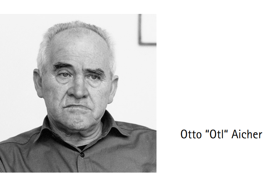 Otto Aicher wuchs, während der Nazionalsozialistischen Diktatur in Deutschland in Ulm auf und gründete später auch die Hochschule für Gestaltung in Ulm. Otto Aicher’s Stil beinhaltete vor allem Piktogramme. Beispiele seiner Designarbeiten finden sich beispielsweise an den olympischen Spielen 1972 oder am Frankfurter Flughafen wieder.