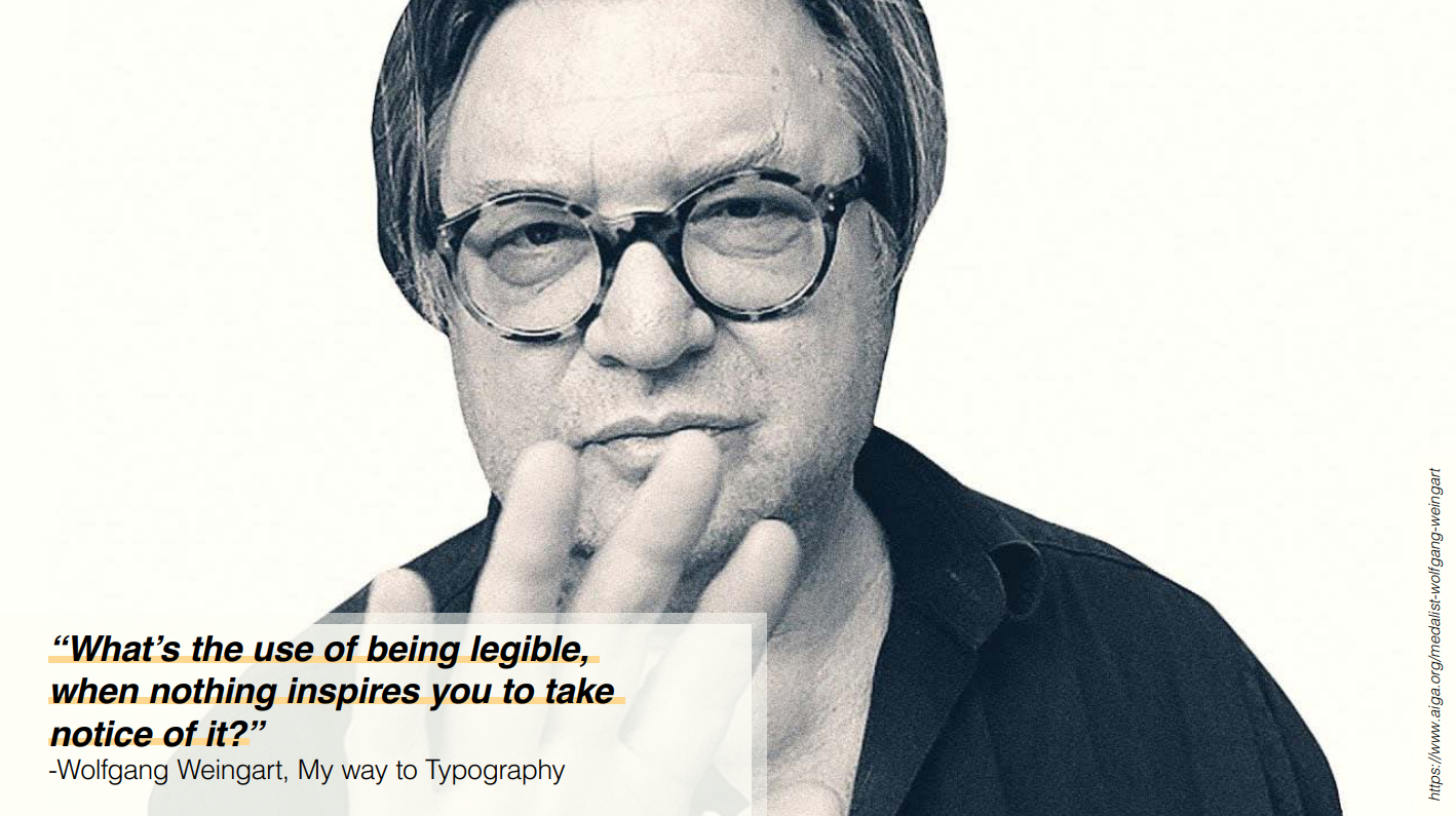 Wolfgang Weingart ist ein Deutscher Typograph. Er ist 1941 geboren. Er ist vorallem